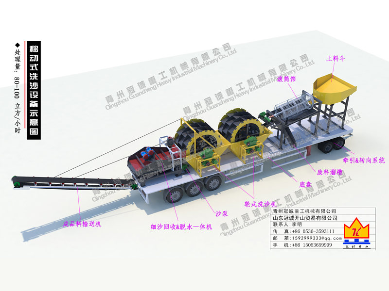 該產品為80-100立方移動式洗砂設備,采用車載輪胎式移動,搭配兩臺三排輪斗洗沙機,加裝移動細沙回收脫水設備,操作簡單,流動式作業(yè),隨洗隨走,省卻了打底座的煩惱,省時高效。